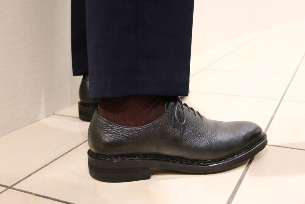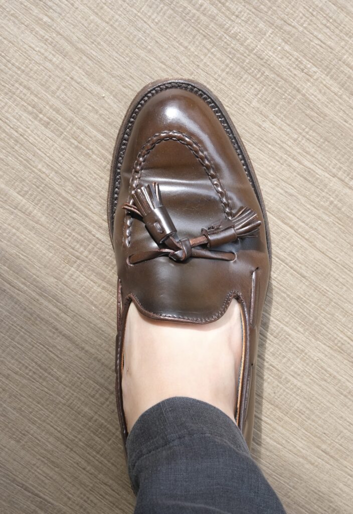 ちなみにローファーからはみ出さないように、という点はしっかり意識されているとイデ・オムの諸澄さんもおっしゃっていましたね。ザ・靴下はみ出し靴のオールデンのタッセルローファーもバッチリです!!