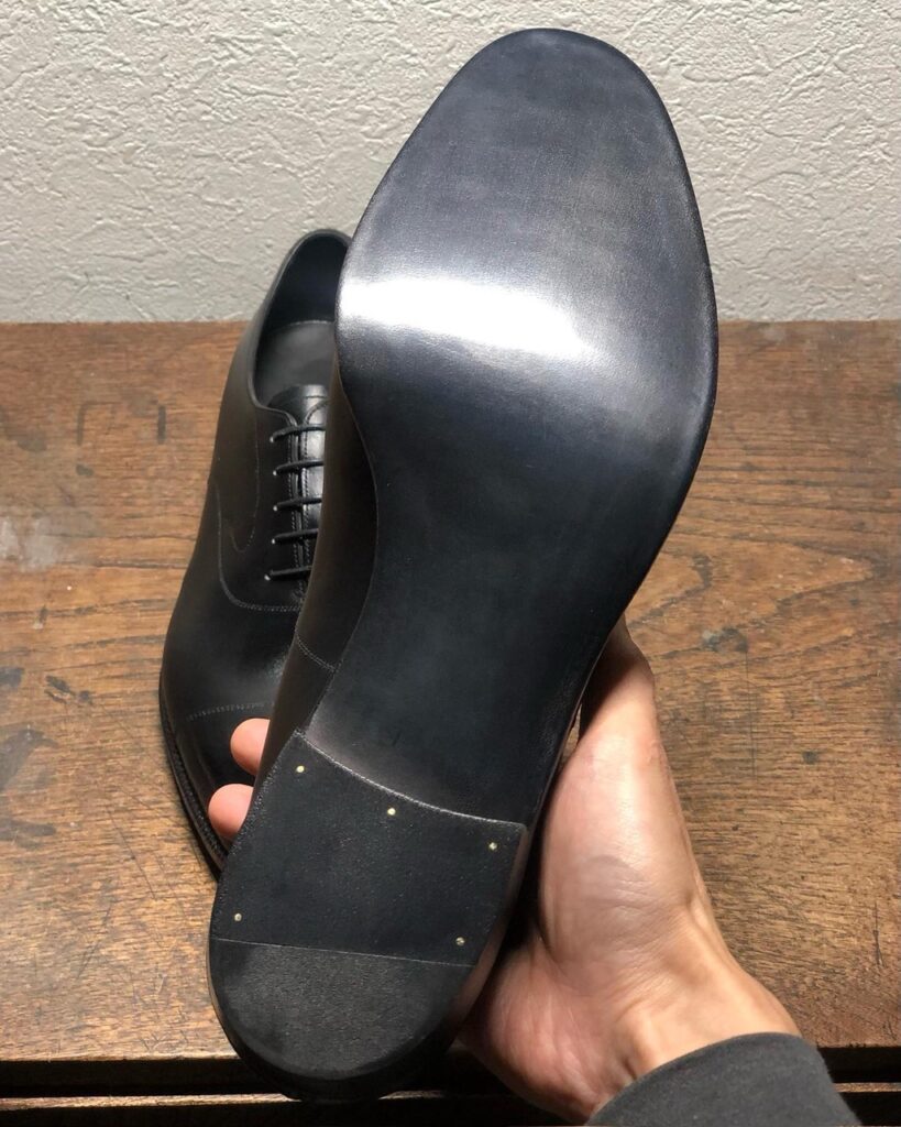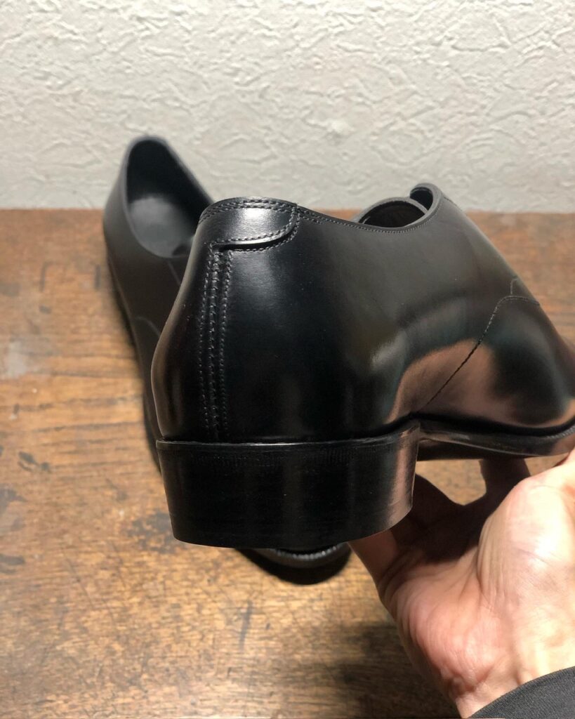ハンドウェルトによる攻めたウエストにカラス仕上げ&ヒドゥンチャネル。もちろんレザーソール。というか出し縫いミシンでここまでウエスト攻められんの!?!?いやこれ、ホントほっそいですよ。