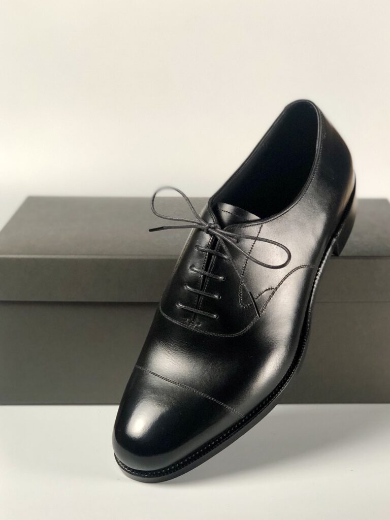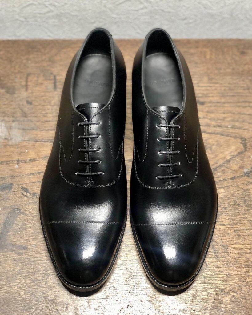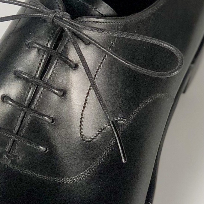 今回の一足はホールカットをベースに、1枚の革の上にステッチでデザインを描いた、イミテーションキャップトゥ。