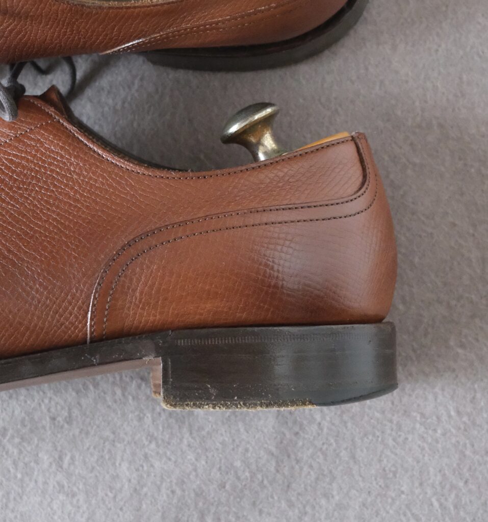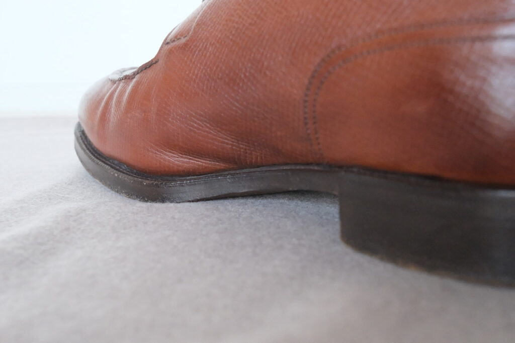 というのも、昔ブラックカーフのドーヴァーも所持していたのですが、そちらはカッチカチでした。もう硬かった……!!ぜんぜん馴染まず、カカトは削れ、しかも幅がDウィズだったのもあって小指のダメージがすごかった……という若気の至りでしたが、とにかく、靴底の返りにアッパーレザーは影響します。