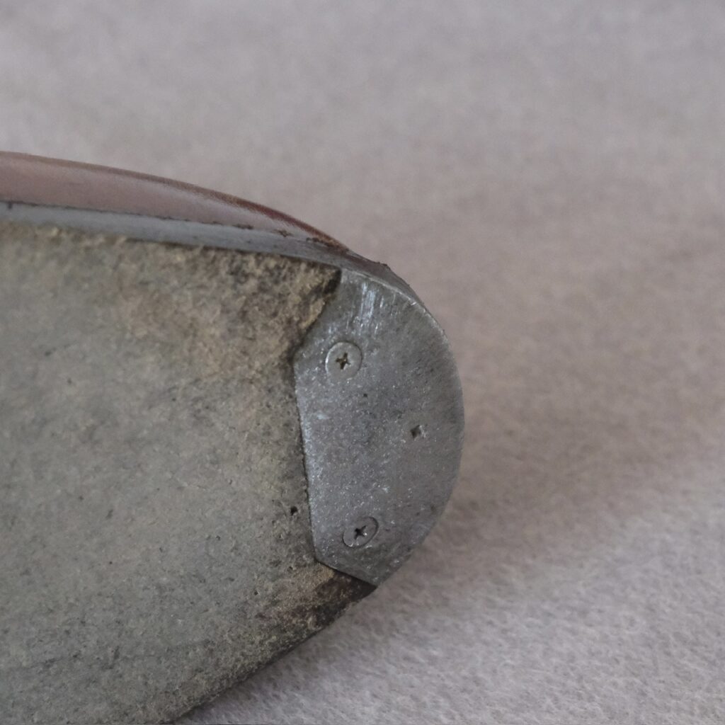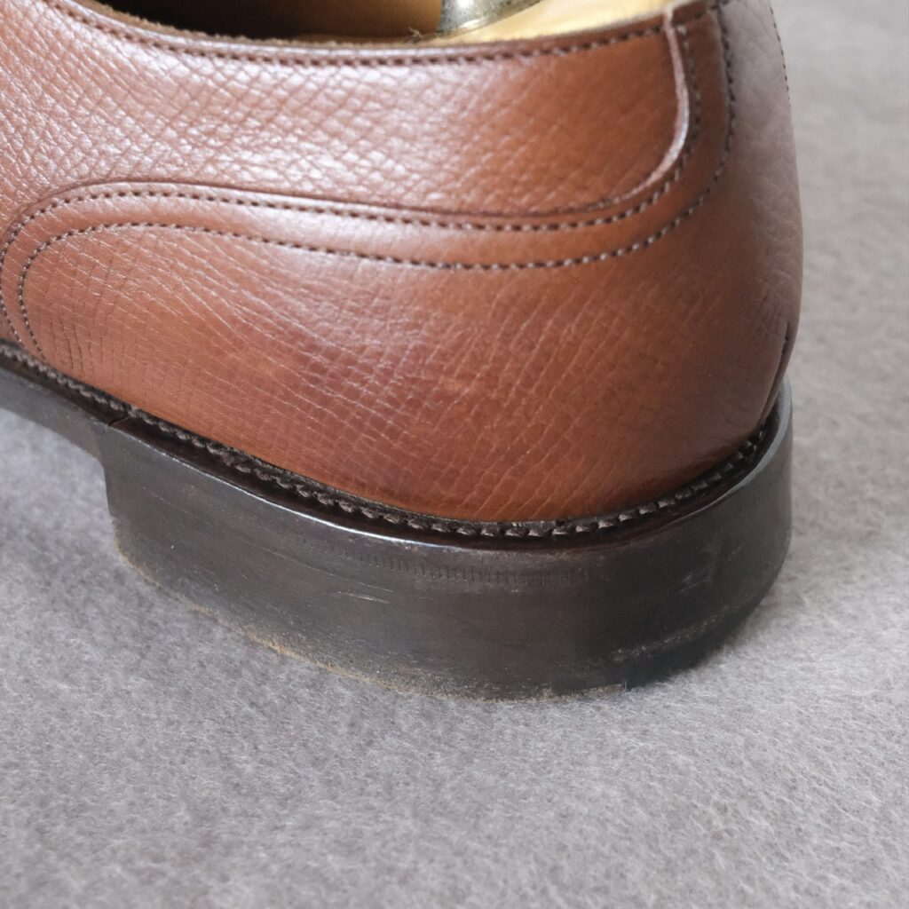 ライトアングルを横断する形のクラックは、このデザインの靴の宿命かもしれませんね。見るからに負担がかかっていそうですし、そもそも革断面を縫う時点で耐久性にも影響がありそうです。
