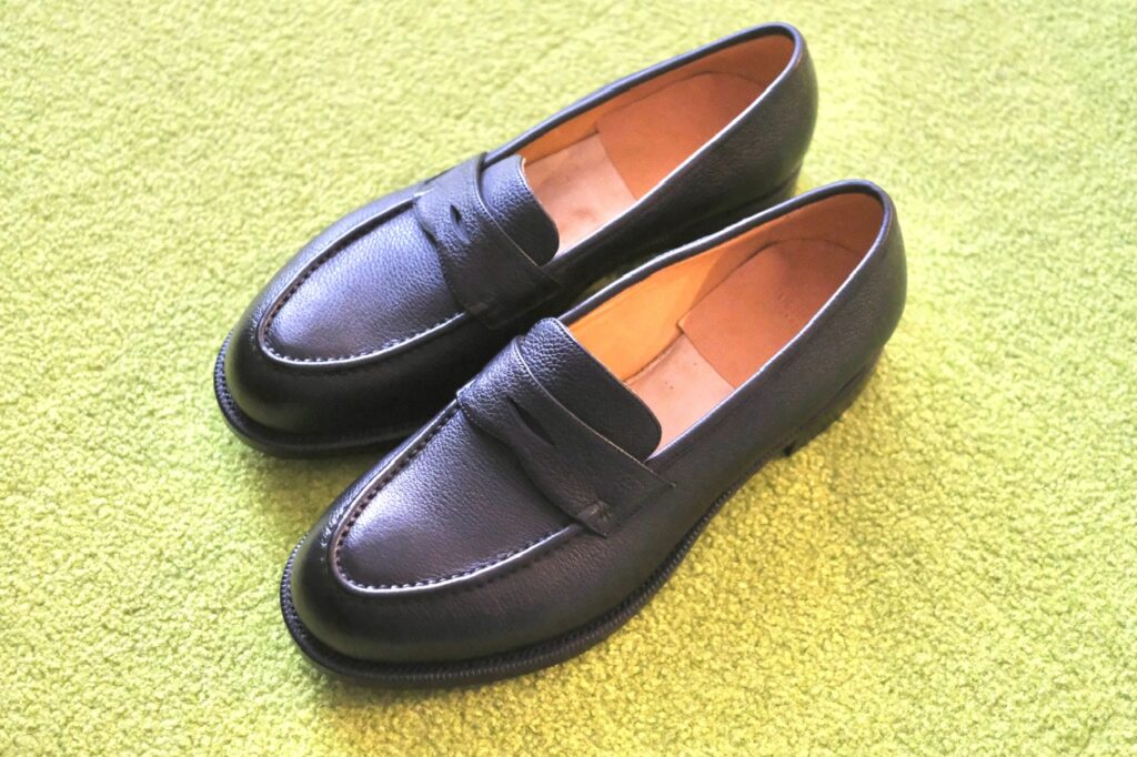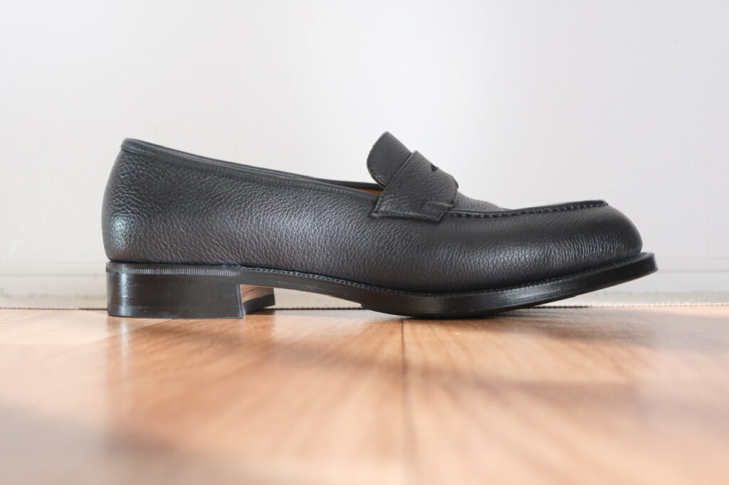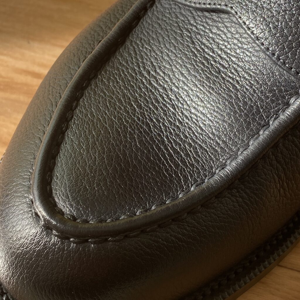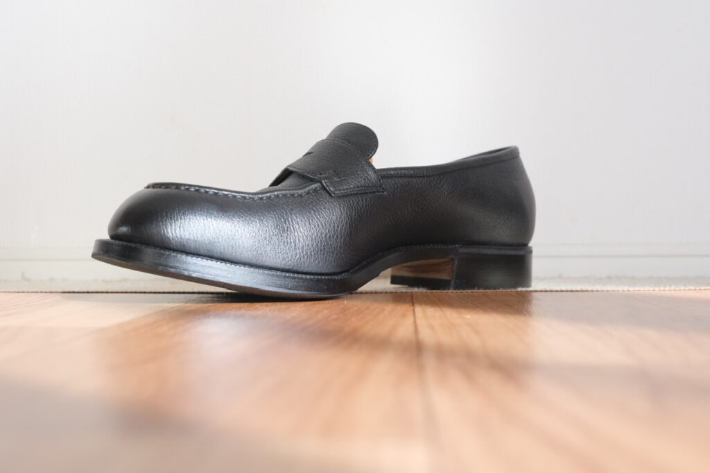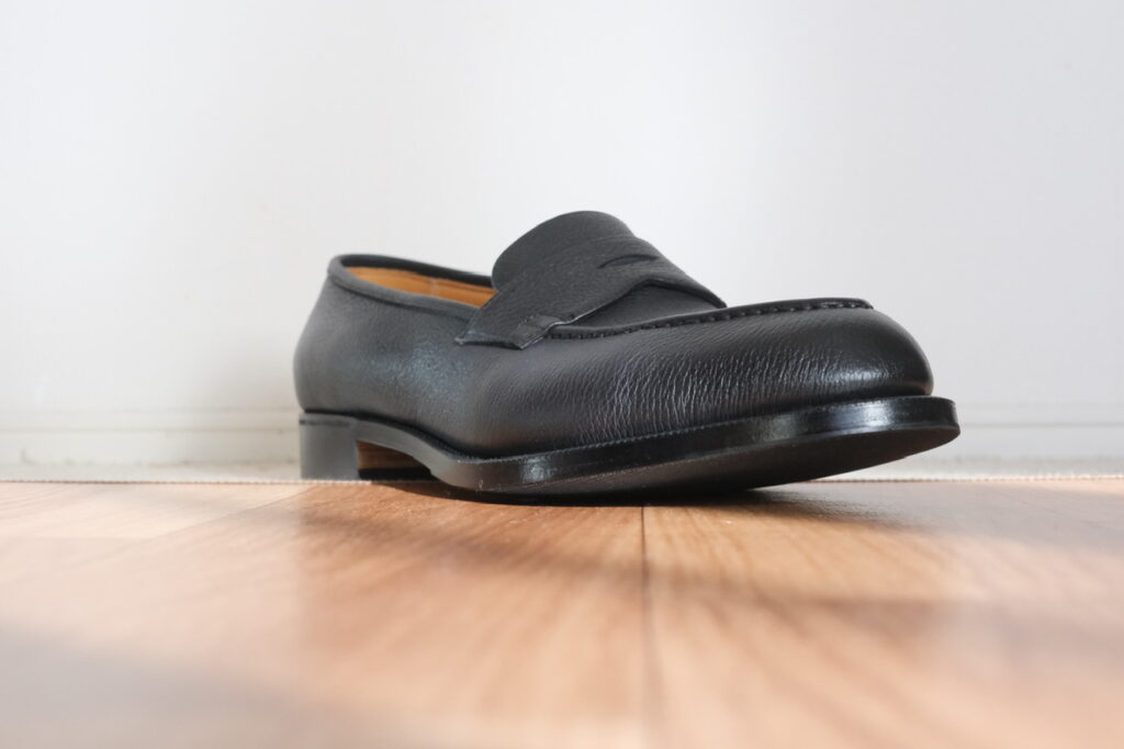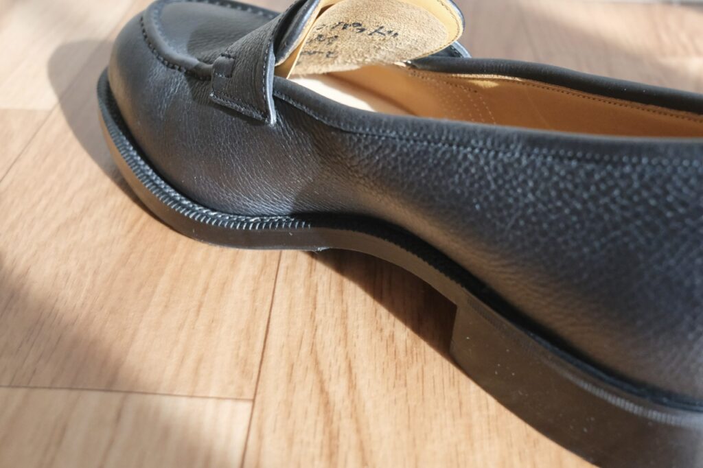 近くで見ればしっかりシボ革です。一律な模様じゃないので、型押しではなく揉み革ですかね。フワッとモチッと柔らかでローファーのフィッティングに貢献しそう……!!もちろん磨き甲斐も◎。光らせてよし、ナチュラル派も良し。なんなら雨に打たれてもケアが楽。シボ革、やはり最強か?