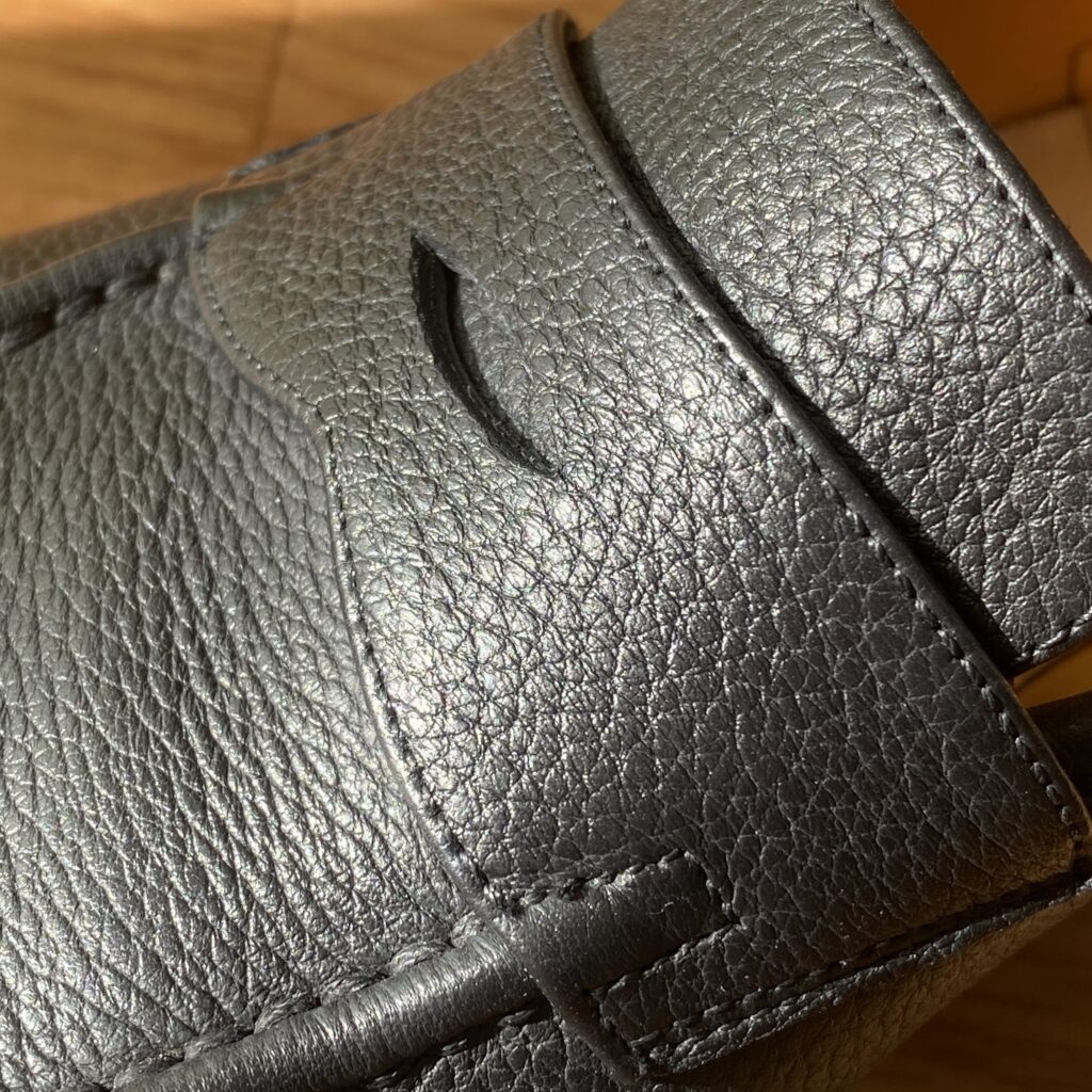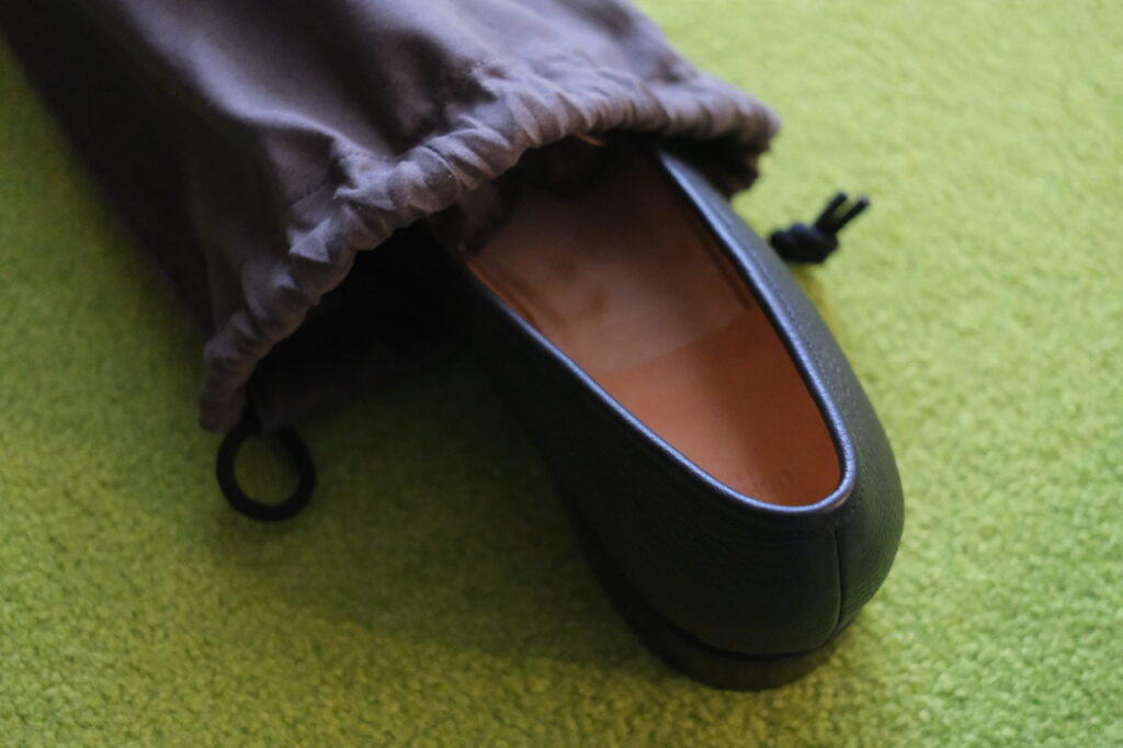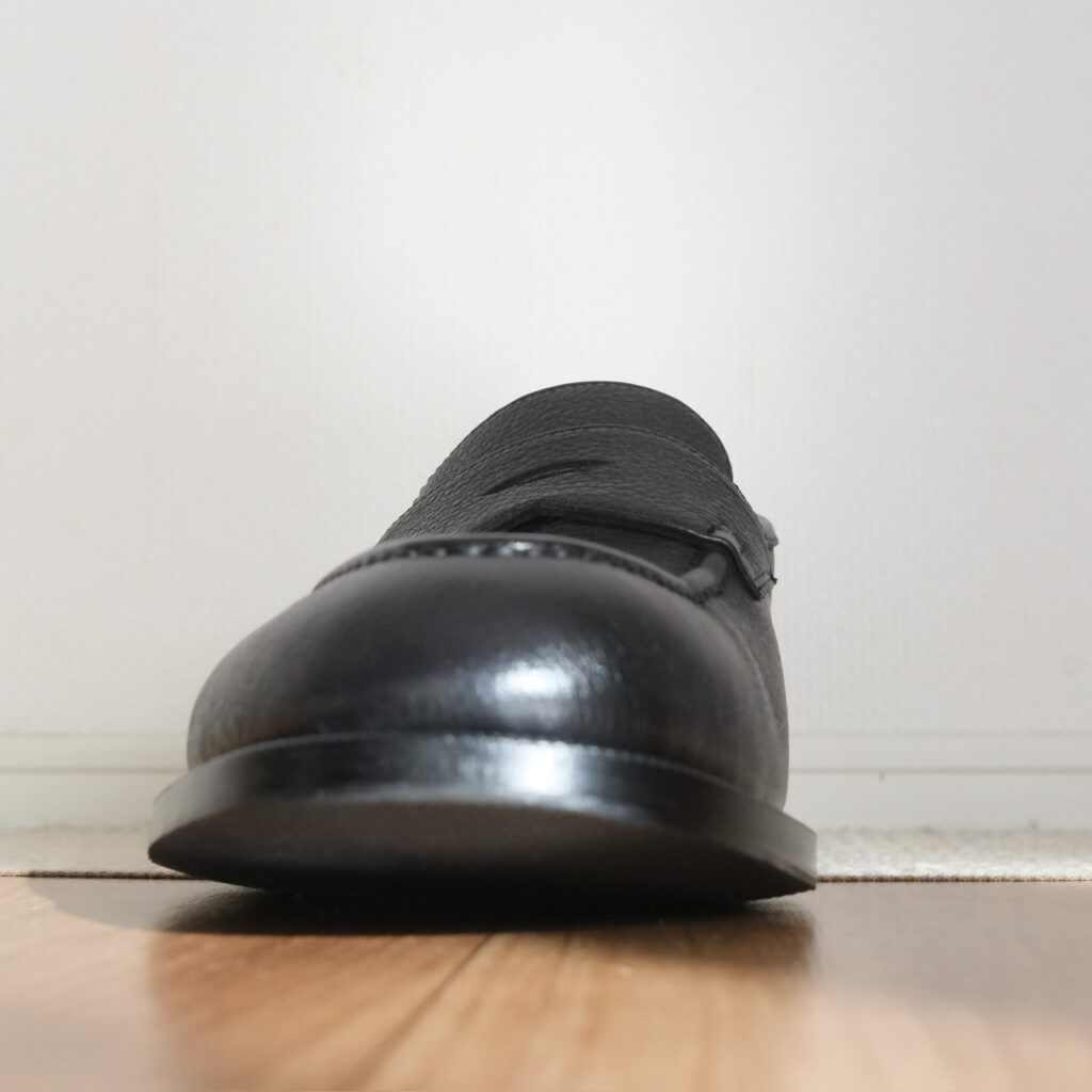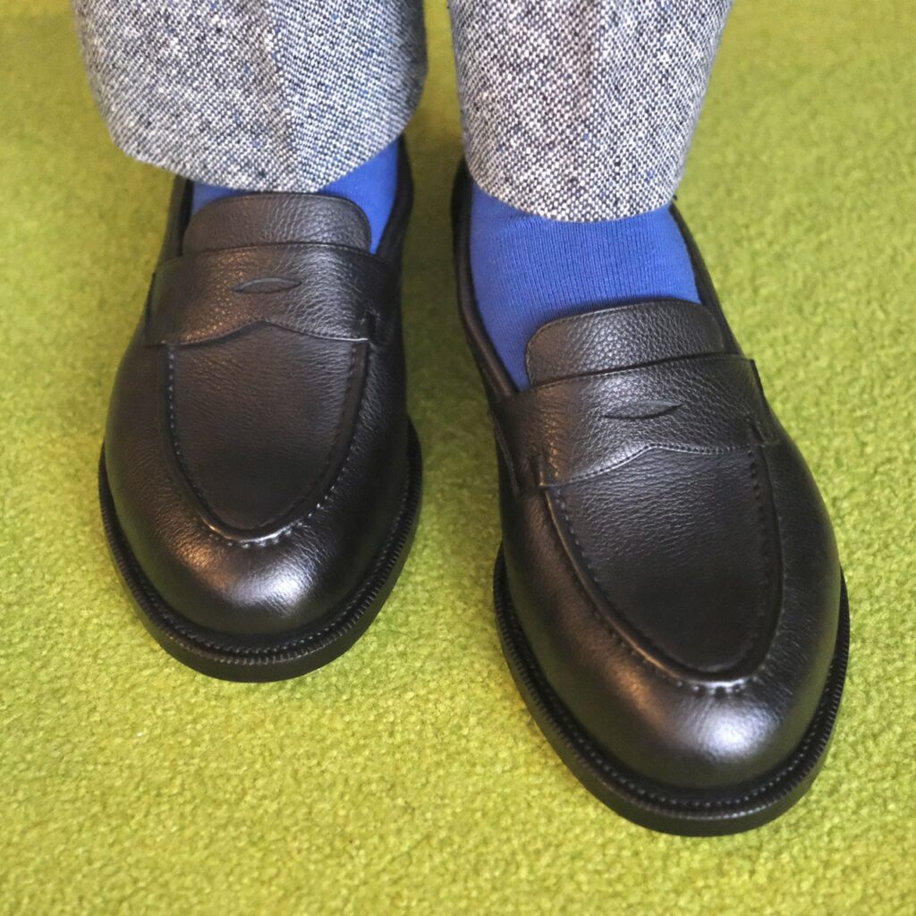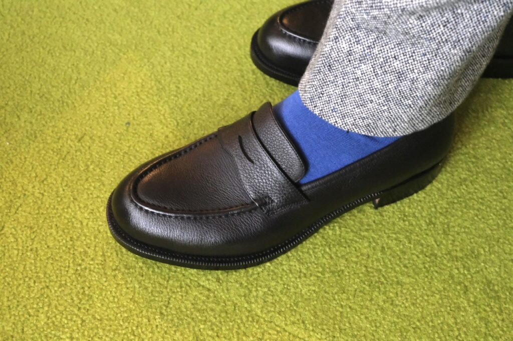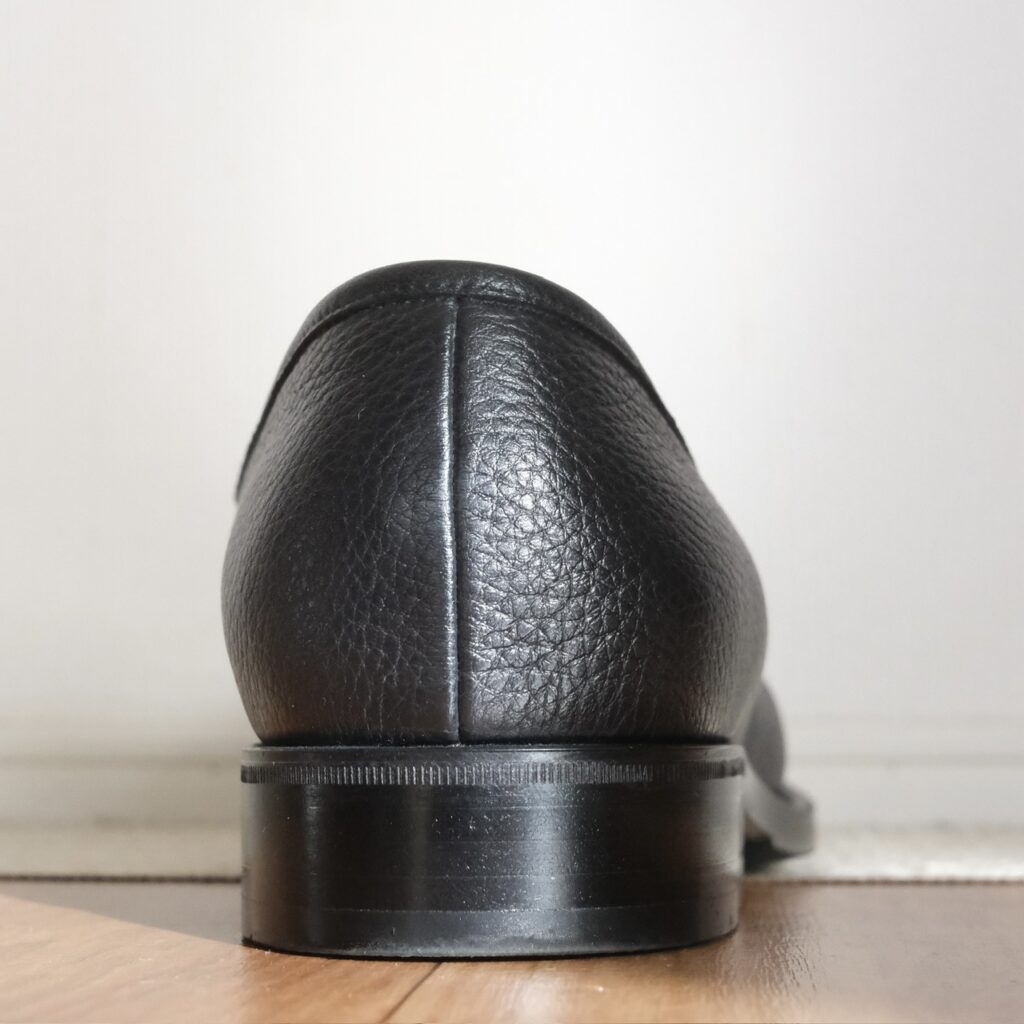 近くで見ればしっかりシボ革です。一律な模様じゃないので、型押しではなく揉み革ですかね。フワッとモチッと柔らかでローファーのフィッティングに貢献しそう……!!もちろん磨き甲斐も◎。光らせてよし、ナチュラル派も良し。なんなら雨に打たれてもケアが楽。シボ革、やはり最強か?