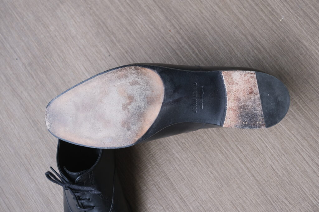 少しだけ染みているような跡もありますが、これは会社で脱いだときに水滴でも踏みましたかね。いずれにせよ、即ソールケアが必要な状態ではないです。