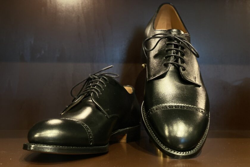 外羽根パンチドキャップで黒い革靴なんて、ジャケパン〜カジュアルまで合わせられる万能選手ですからね。ロングノーズでなく、適度にショートノーズでクラシカルかつカジュアルに合わせやすいのもポイントです。絶妙な長さ!